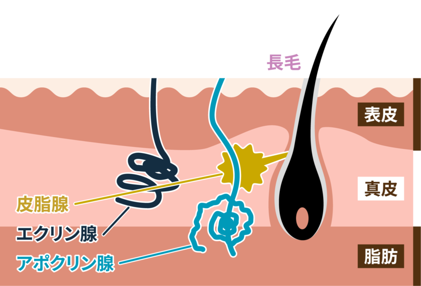 体温調整のために、スポーツをした時や暑い時にでる汗は主にエクリン汗腺からです。サラサラした汗で99%が水分、1%が塩分なので臭いはありません。臭いの原因は主にアポクリン汗腺から出る汗で、特定の部分(ワキ、外陰部、肛門周辺、乳輪、外耳道など)に存在し、タンパク質を含みます。