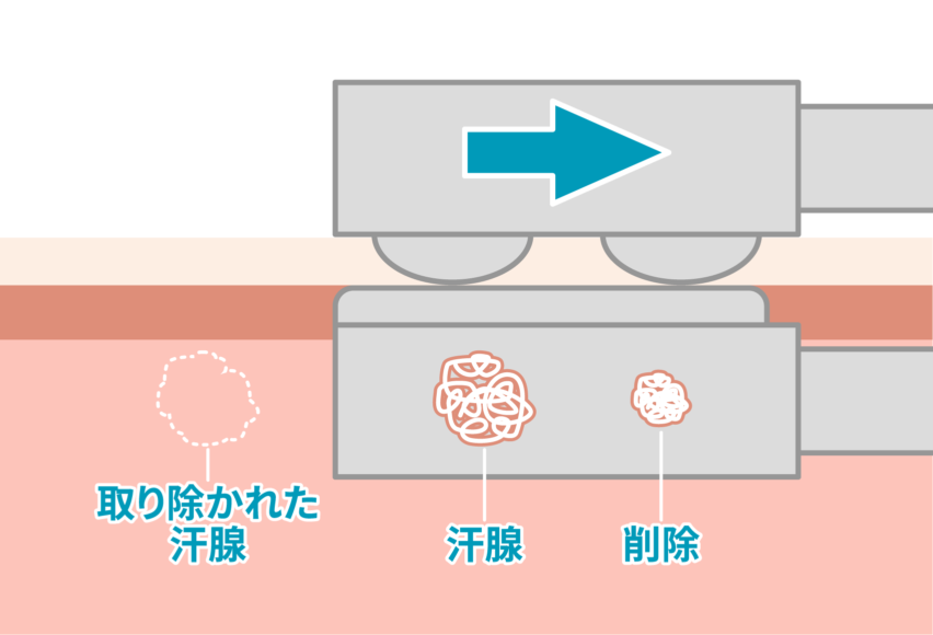 ローラーなどの器具で挟み込んで削る方法と違い、手術後に皮膚が茶褐色になることもありません。ワキの下のシワ内部を切開するので、傷はシワの一部になります。