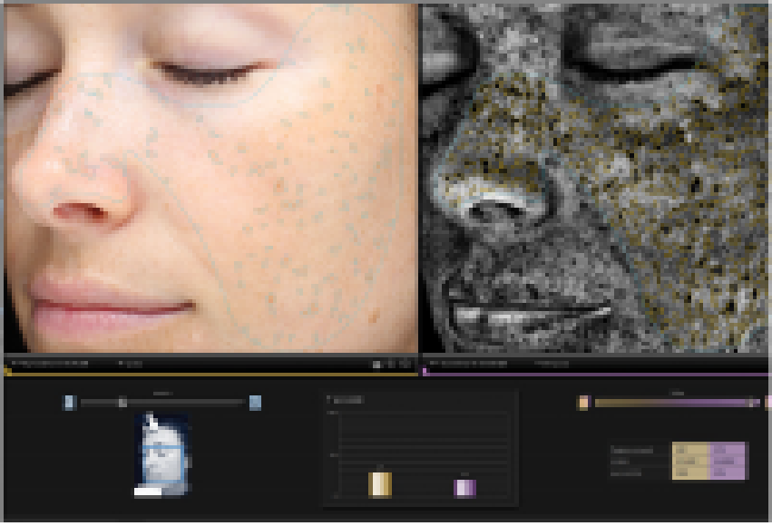 例えば「シミ」の場合、シミの数とMask範囲指定した中での%表示、また光源が一定で、外光の影響を受けず、同年代のMedian Scoreとの比較で表示されます。UV解析の場合は、「表面化しているシミ」と「かくれジミ」の数が表示されます。かくれジミ(かくれジミ予備軍)を把握することが出来る為、シミが表面化する前にケアする事が出来ます。